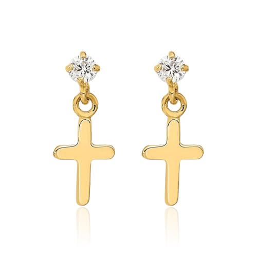 14K Solid Yellow Gold Cubic Zirconia CZ Holy Cross Post Drop Dangle Christian Religious Earrings 1