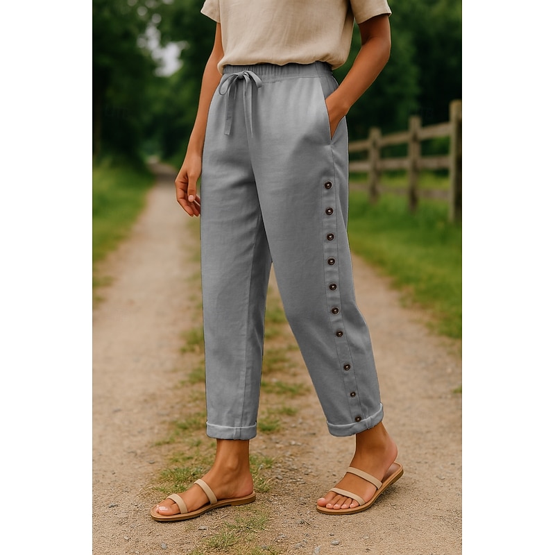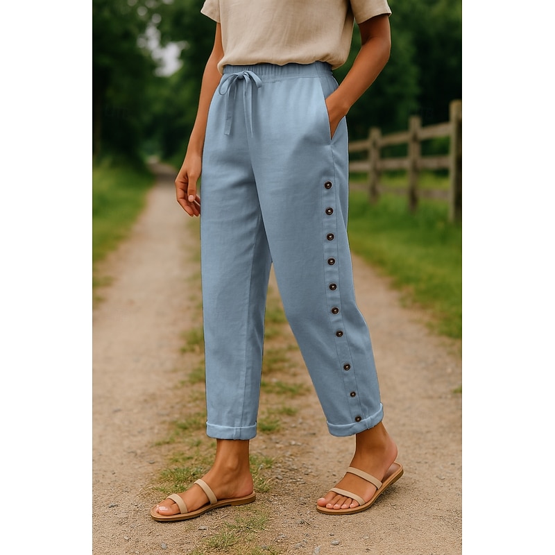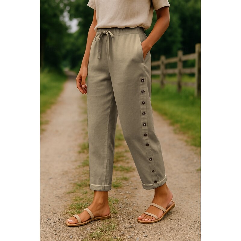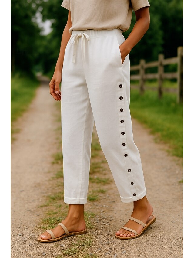 More information about Women's Cotton Linen Pants Comfort Full Length High Waist Plain Pocket Elastic Waistband Comfy Outdoor Comfortable Street Daily Wear Going out Black White Blue Khaki Summer Regular Fit