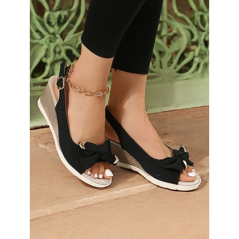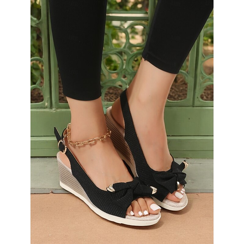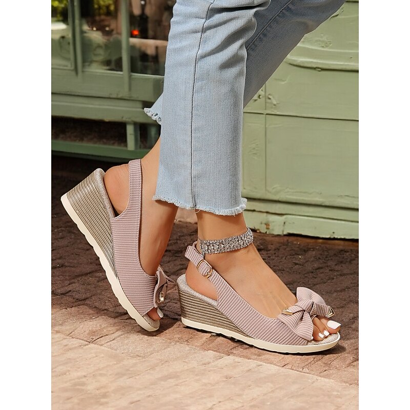 HOT ! Women's Beige Wedge Sandals with Bow Accent, Open-Toe Design, Comfortable Slingback Style for Casual Summer Outings and Beachwear