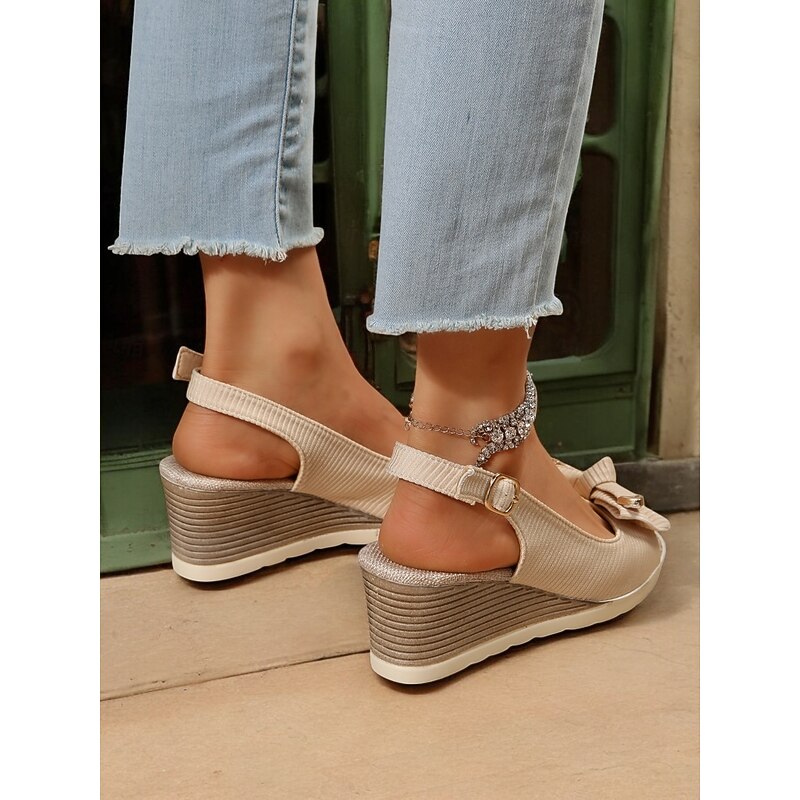 Women's Beige Wedge Sandals with Bow Accent, Open-Toe Design, Comfortable Slingback Style for Casual Summer Outings and Beachwear 1