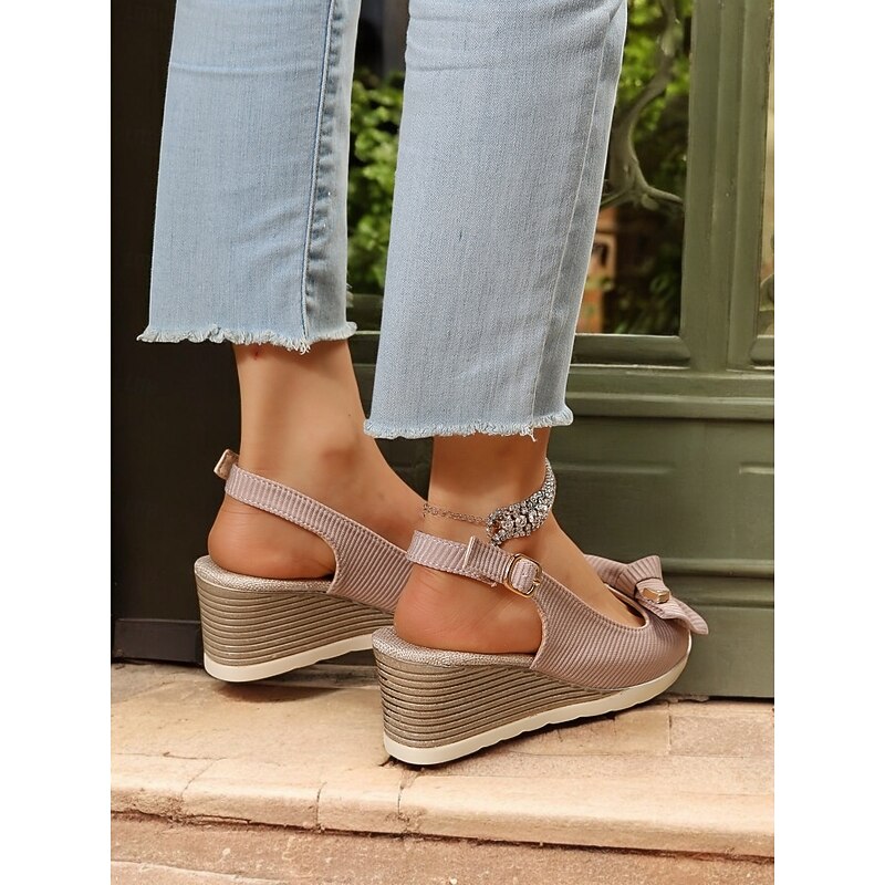 Women's Beige Wedge Sandals with Bow Accent, Open-Toe Design, Comfortable Slingback Style for Casual Summer Outings and Beachwear 22