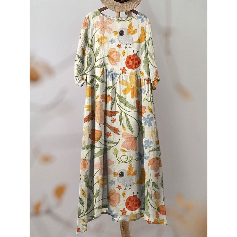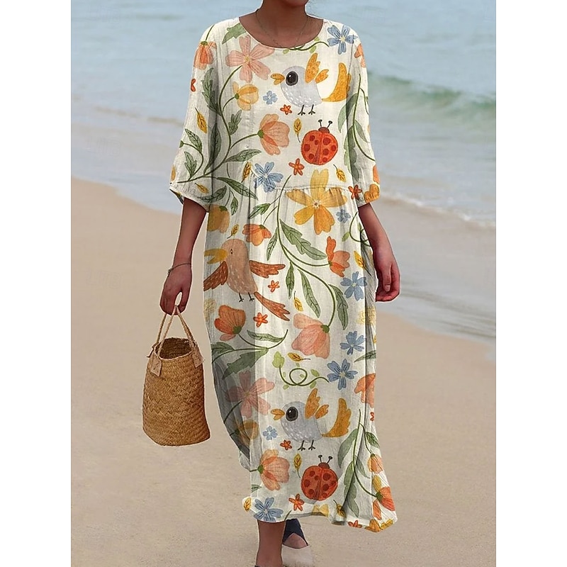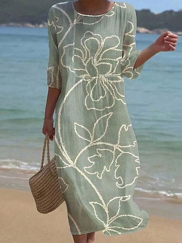 HOT ! Women's Maxi Dress Kaftan 3/4 Length Sleeve Crew Neck Casual Dress A Line Dress Boho Loose Fit Floral Graphic V Neck White Yellow Light Green Green Spring Fall
