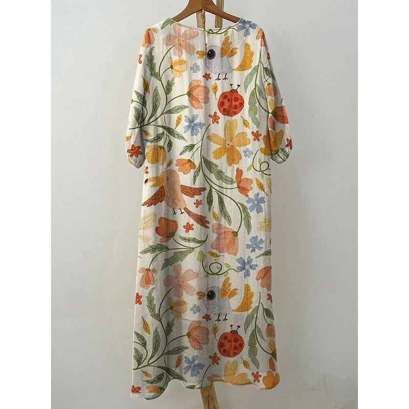 Women's Maxi Dress Kaftan 3/4 Length Sleeve Crew Neck Casual Dress A Line Dress Boho Loose Fit Floral Graphic V Neck White Yellow Light Green Green Spring Fall 10