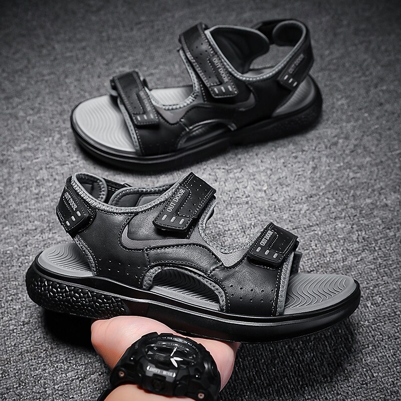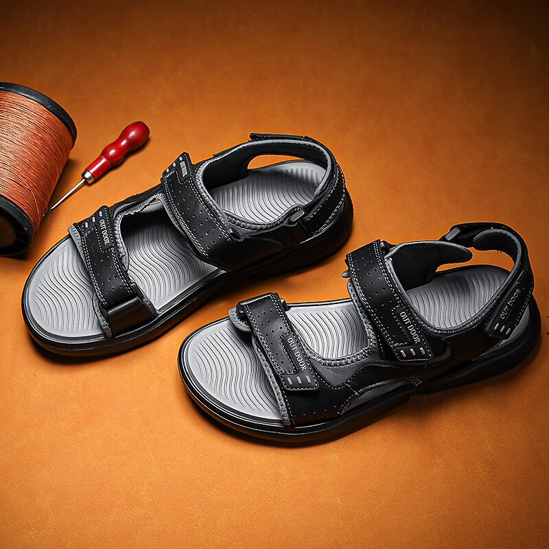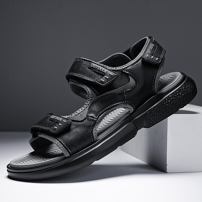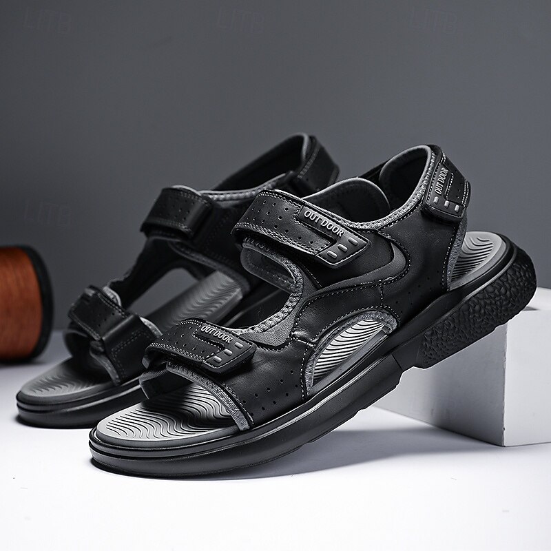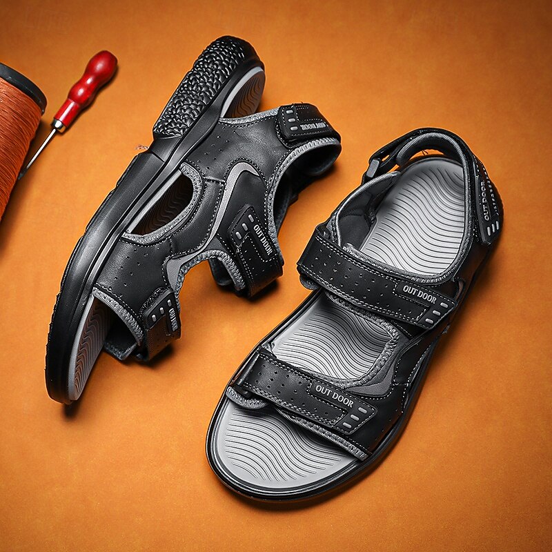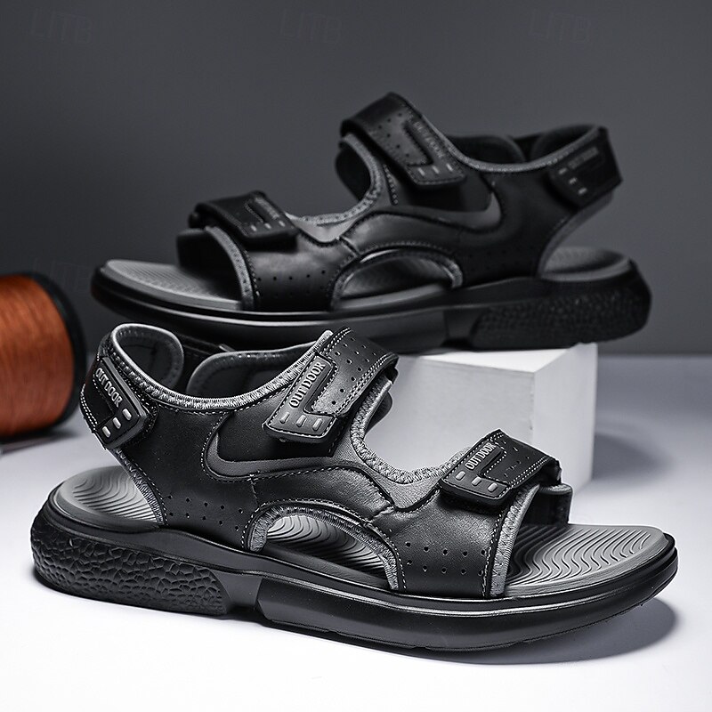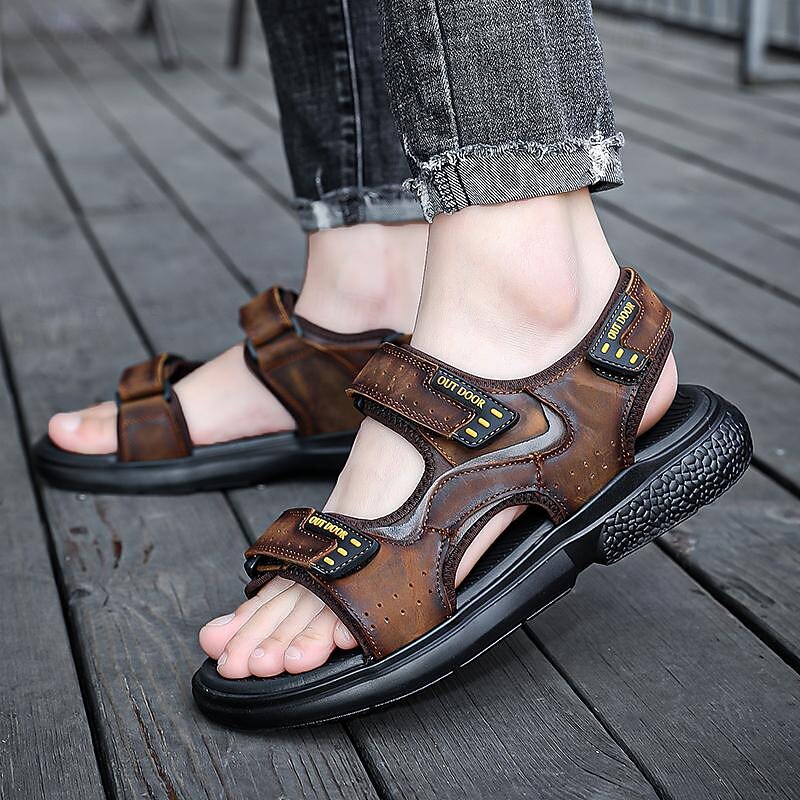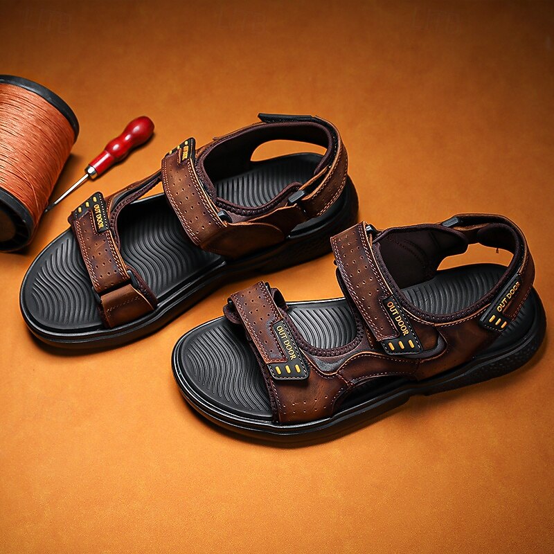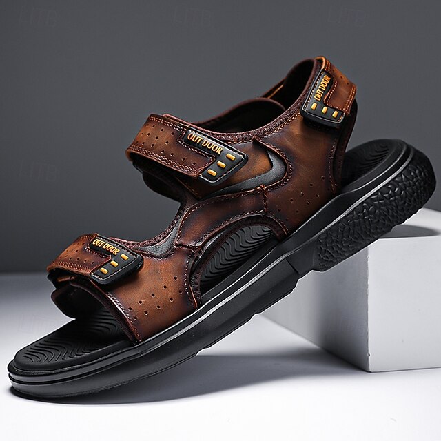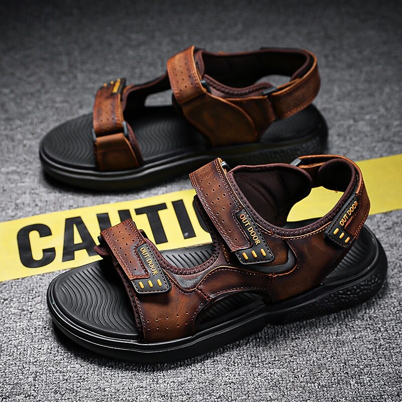 HOT ! Men's Brown Faux Leather and Mesh Sport Sandals with Dual Buckle Straps – Durable Outdoor Sandals for Hiking, Beach or Vacation Wear