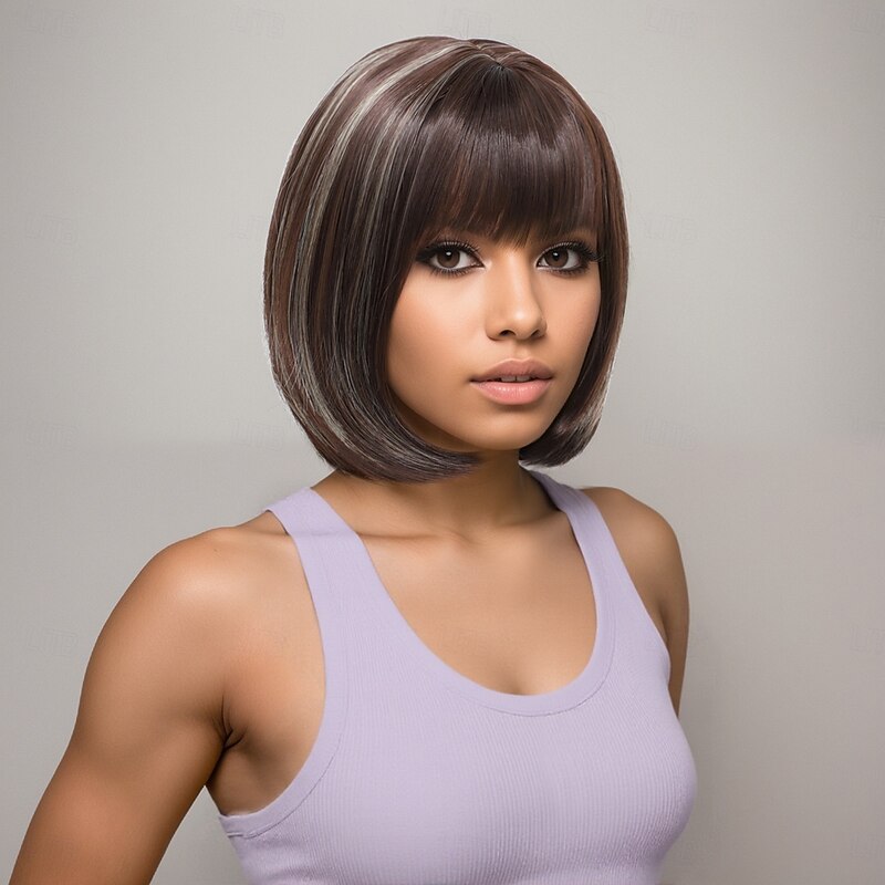 Synthetic Wig kinky Straight Natural Straight Asymmetrical Neat Bang Machine Made Wig 12 inch A1 Synthetic Hair Women's Classic Adorable Comfortable Dark Gray 10