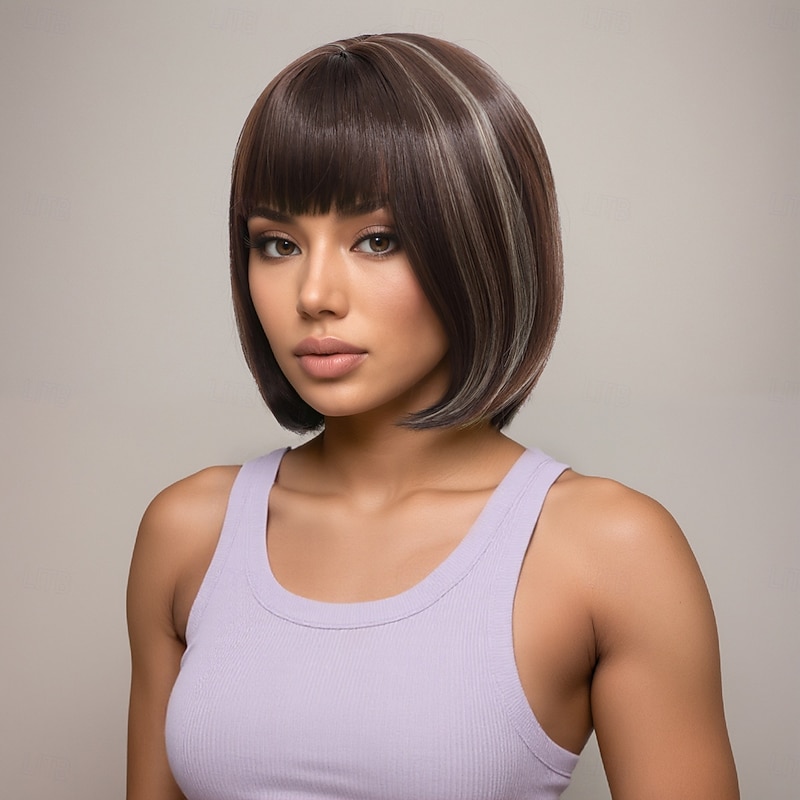 Synthetic Wig kinky Straight Natural Straight Asymmetrical Neat Bang Machine Made Wig 12 inch A1 Synthetic Hair Women's Classic Adorable Comfortable Dark Gray 8