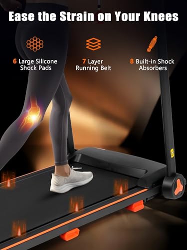• Wide Running Belt & Shock Absorption: The walking treadmill provides a large track for free movement features a spacious running area(43.31" x 15.75"), and is equipped with 7 layers of the anti-slip belt, 8 silicone shock absorbers, plus 6 soft rubber pads, It can not only provide you with a comfortable exercise experience but also effectively reduce joint impact and protect your knees