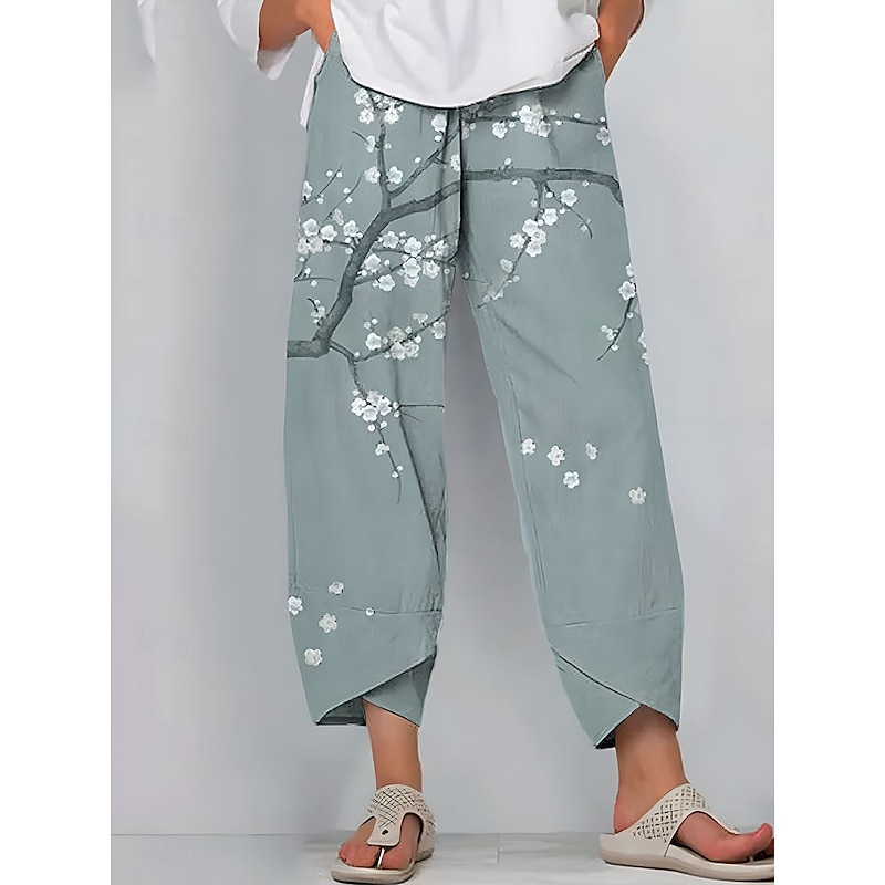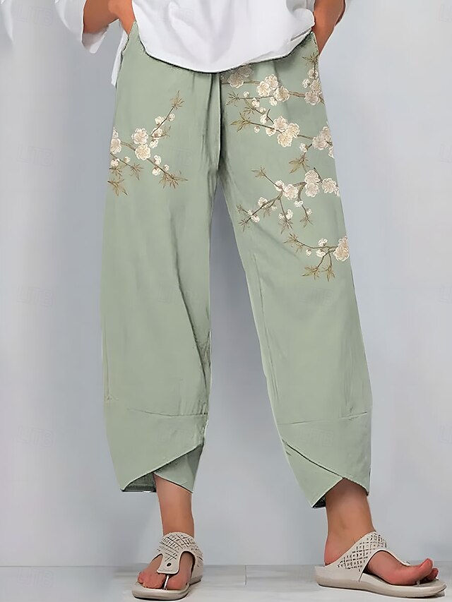 More information about Women's Wide Leg Chinos Baggy Pants Vintage Basic Casual Ankle-Length High Waist Floral Graphic Drawstring Patchwork Printing Breathable Inelastic Outdoor Vacation Street Yellow Blue Green Beige