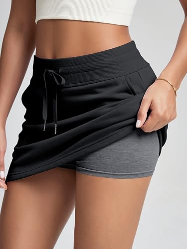 HOT ! ODODOS Women's Cotton French Terry Skorts Drawstring Tie Built-in Shorts Daily Skirts with Pockets