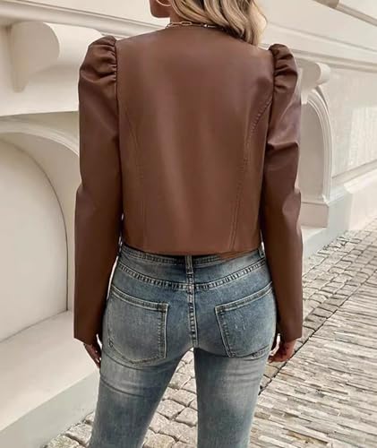 SEMATOMALA Women's Puff Sleeve Cropped Jacket Faux Leather Bolero Blazer Long Sleeve Open Front PU Cardigan 5