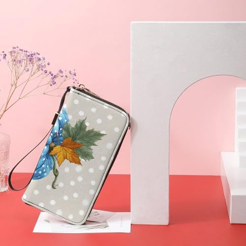 Blue Pumpkin with Autumn Leaf PU Leather Clutch Long Bifold Wallet, Coin Purse Credit Pass Case, Durable Card-Holder Money Storage for Women Men 6