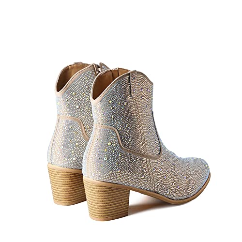 keleimusi Women Western Cowgirl Rhinestone Ankle Boots Pointed Toe Glitter Chunky Heel Sparkly Shoes