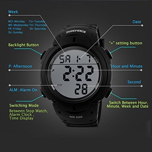 • Digital watch:Fashionable sporty dial design, military style outlook. Large Dial and numbers with light, show time clear in the dark.Use import EL Lamp,Press"LIGHT"button to see the time clearly in the light, easy to read.