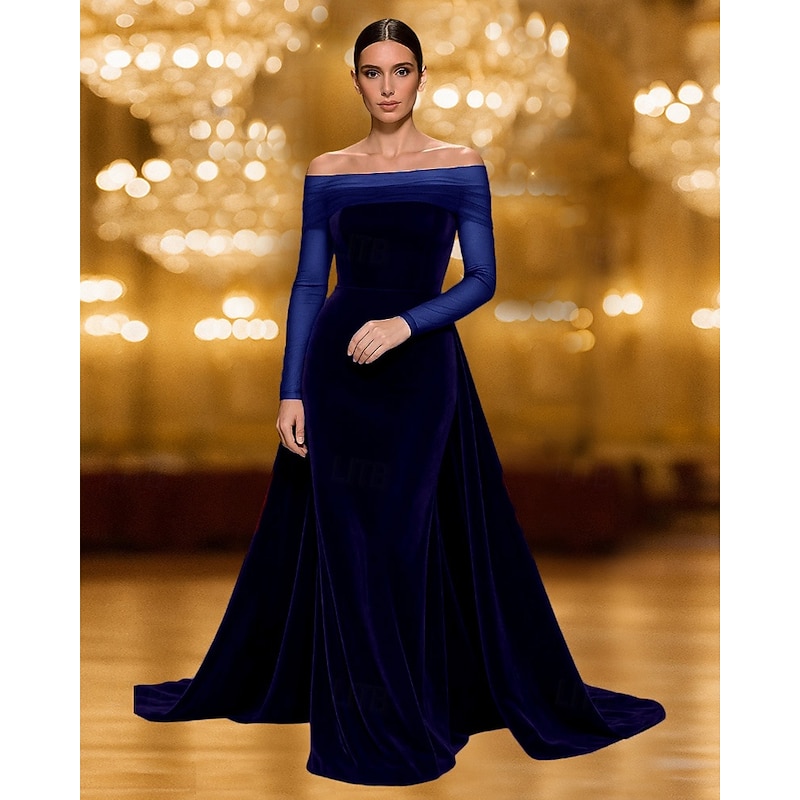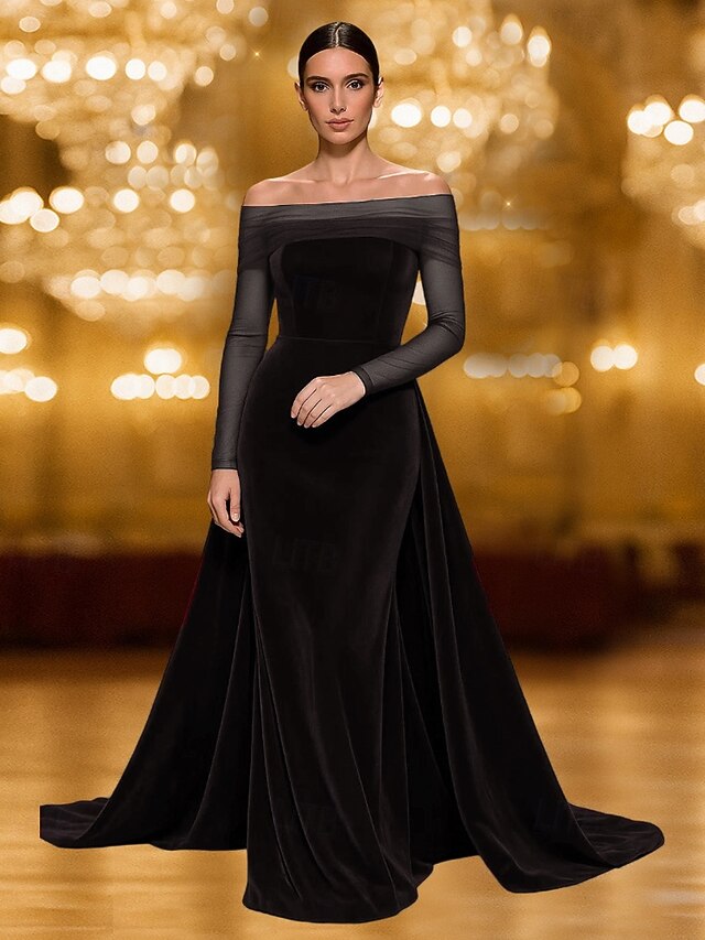 HOT ! Black Velvet Mermaid / Trumpet Stretch Velvet Evening Gown with Overskirt Elegant Dress Formal Wedding Sweep / Brush Train Sleeveless Off Shoulder Tulle 2025