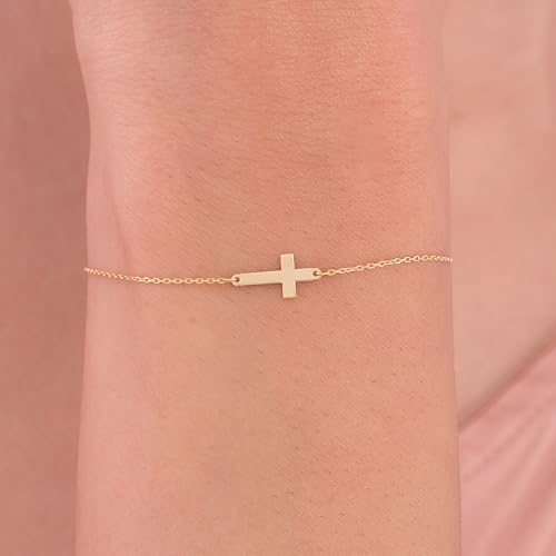 14K Gold Plated Cross Bracelet for Women, Bracelets, Real Gold Sideways Adjustable Bracelet for Women, Christian Baptism Gift 1