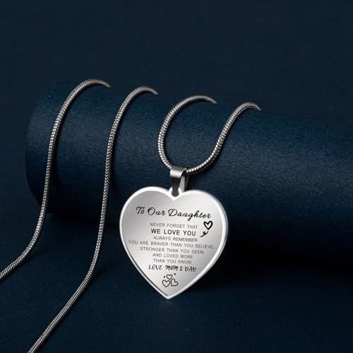 • ♥Inspirational Necklace: To Our Daughter...NEVER FORGET THAT WE LOVE YOU,ALWAYS REMEBER YOU ARE BRAVER THAN YOU BELIEVE,STRONGER THAN YOU SEEM,AND LOVED MORE THAN YOU KNOW...LOVE MOM & DAD.The inspirational quote on the heart pendant will remind her that mom and dad are always believe in her.