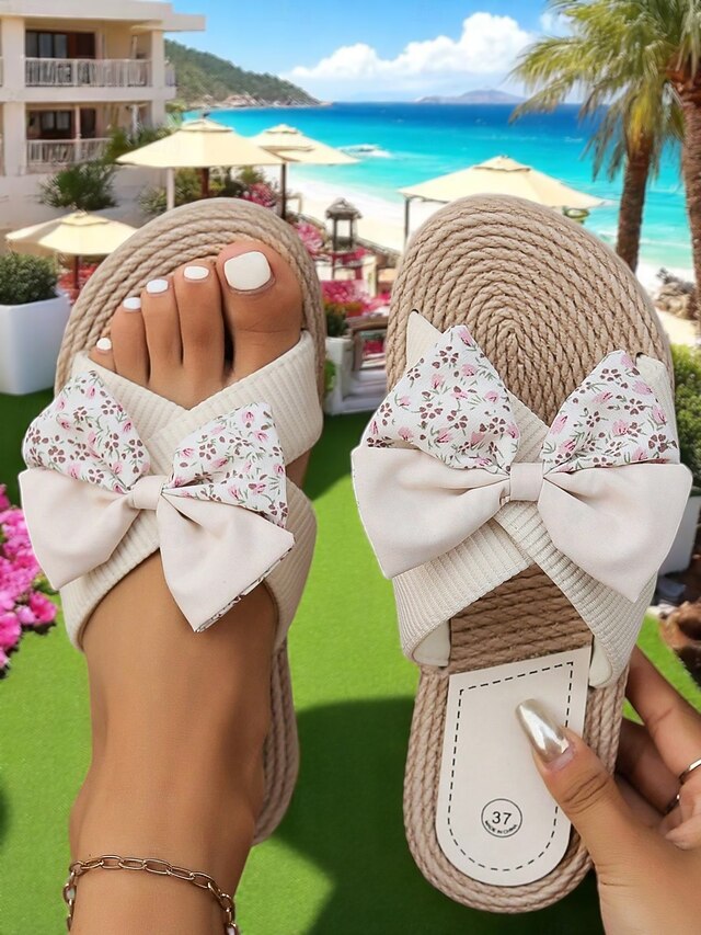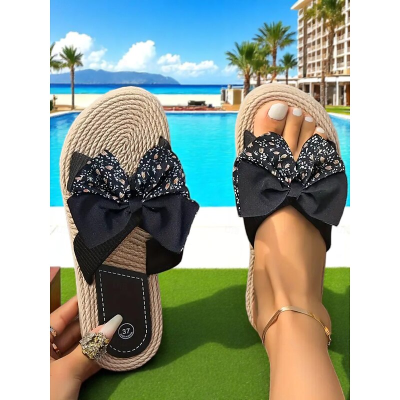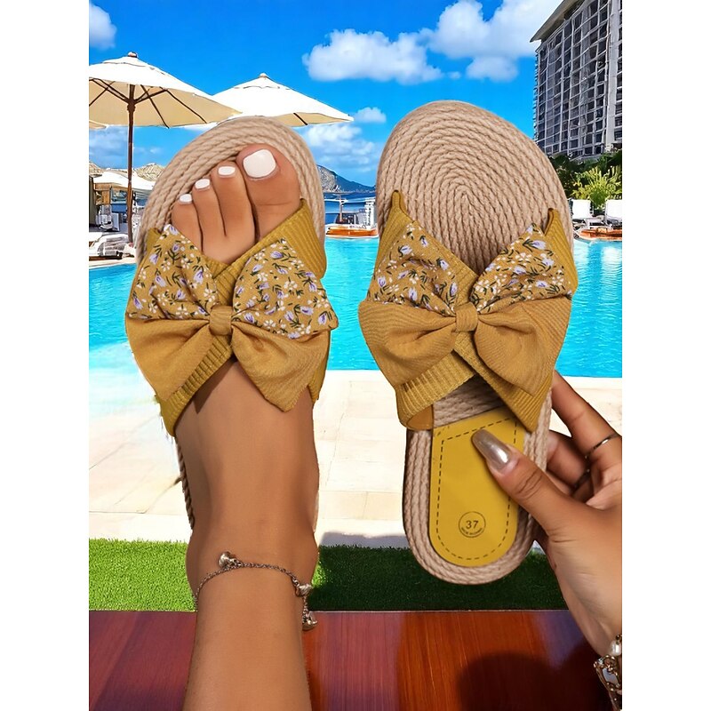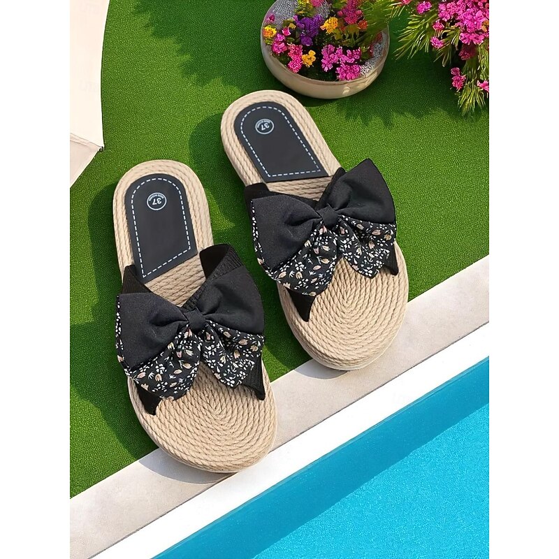 HOT ! Women's Floral Bow Slip-On Rope Sandals – Cute Summer Beach Slides with Woven Sole for Vacations, Garden Parties, and Casual Daily Wear