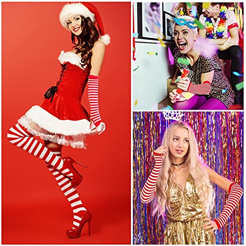 Elfcool 2/4 Sets Womens Long Striped Knee High Socks Knit Fingerless Arm Warmers for Halloween Christmas 5