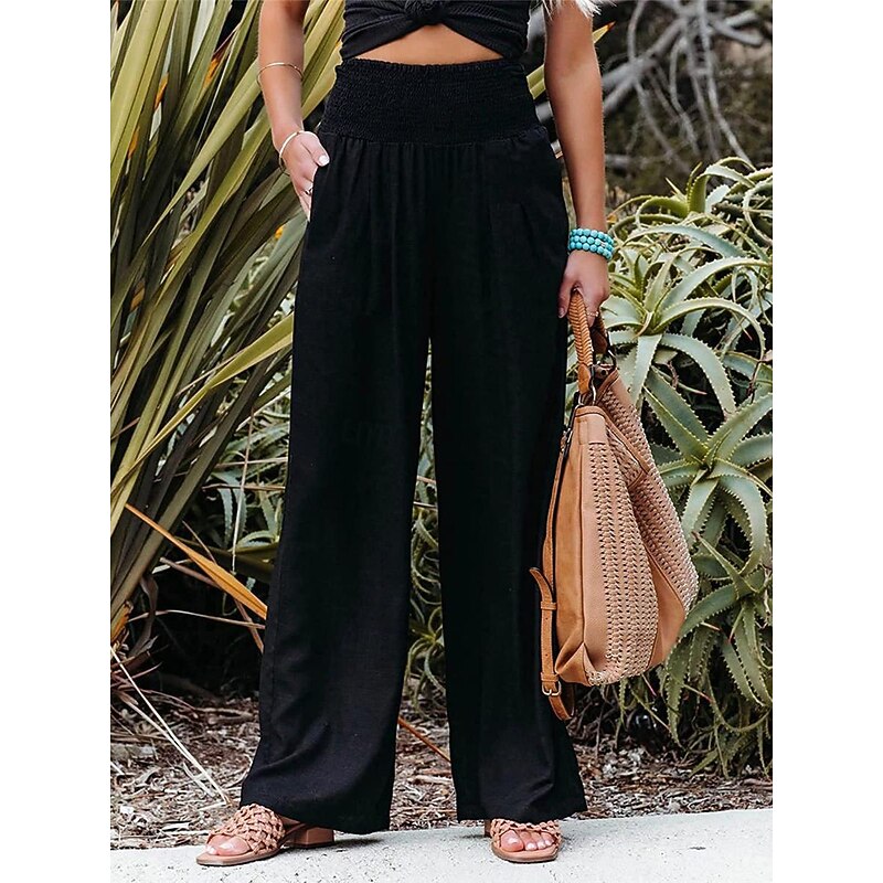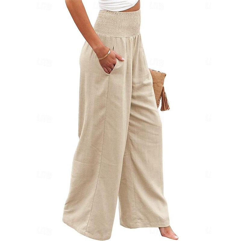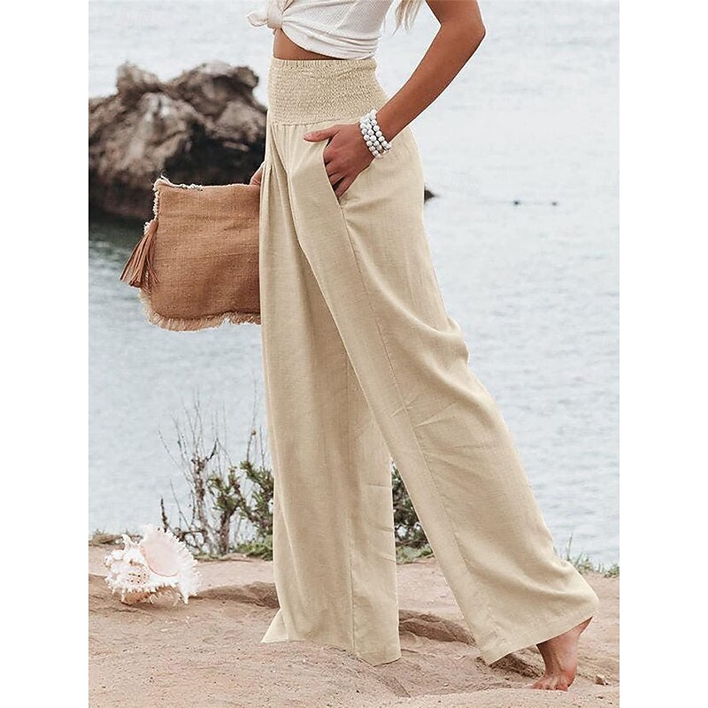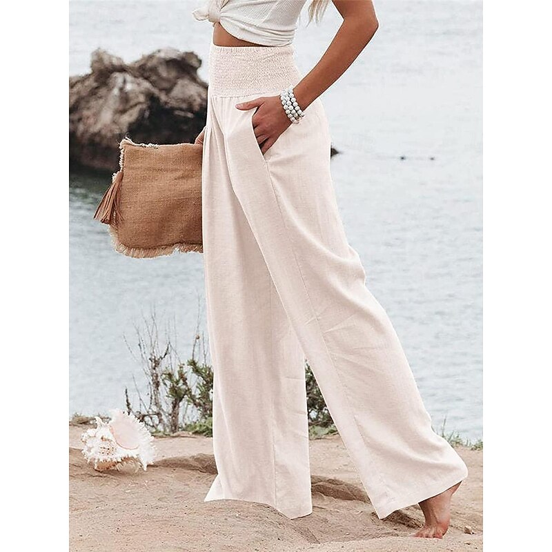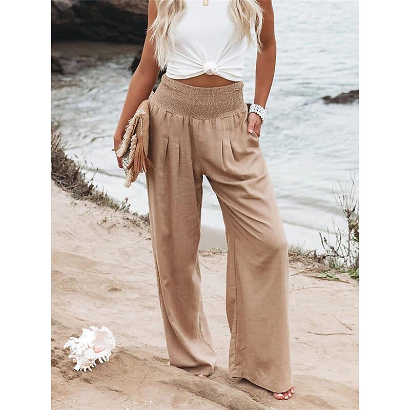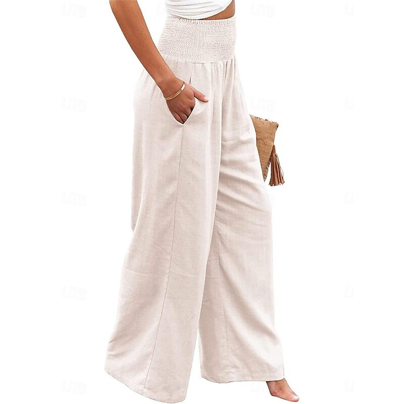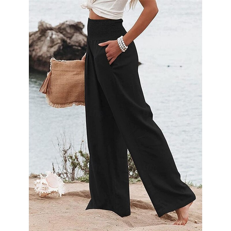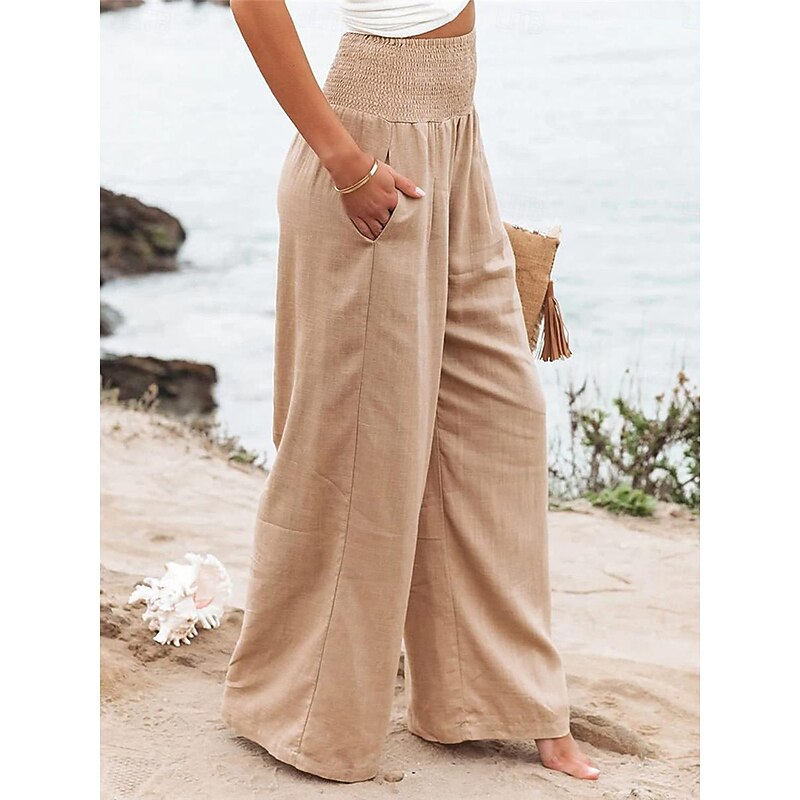 Highlights [Fabric] : Crafted from a blend of cotton and linen, these women's pants are designed for breathability and comfort, making them ideal for the summer season. The fabric offers a micro-elastic feel, ensuring ease of movement and a relaxed fit. [Fit] : These pants feature a high-waisted, wide-leg cut that combines fashion with comfort. The relaxed silhouette allows for effortless styling, creating a chic, laid-back look suitable for various occasions. [Design Highlights] : The pants come with a smocked elastic waistband that provides a snug and adjustable fit, while the classic pocket design adds convenience and practicality. The pure color options—White, Black, Pink, and Khaki—enhance the versatility of these pants, allowing you to pair them easily with your favorite tops and accessories. [Occasions] : Perfect for daily wear at home or casual outings, these pants combine style and functionality. Their breathable fabric and relaxed design make them an excellent choice for warm weather activities, whether you're heading to the beach or enjoying a leisurely day out. [Size Range] : Available in sizes S, M, L, XL, 2XL, and 3XL, these pants cater to a wide range of body types, ensuring a comfortable and flattering fit for everyone.