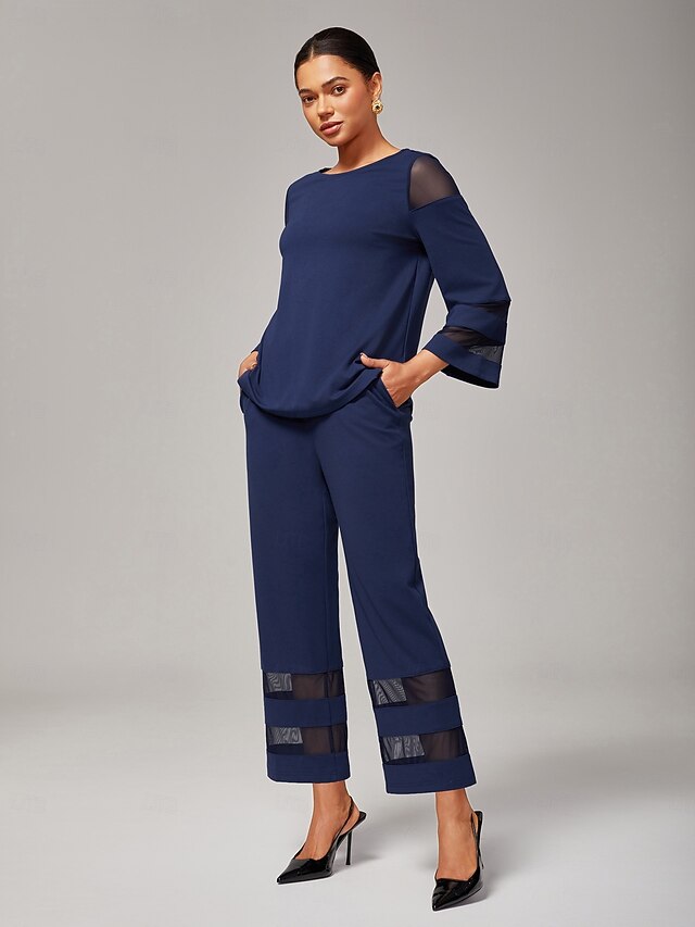 Women's Navy Blue Modal Chiffon Matching Set Fitted Blouse Cropped Pants Elegant Stylish Comfortable Daily Work Evening Wear Fall 2