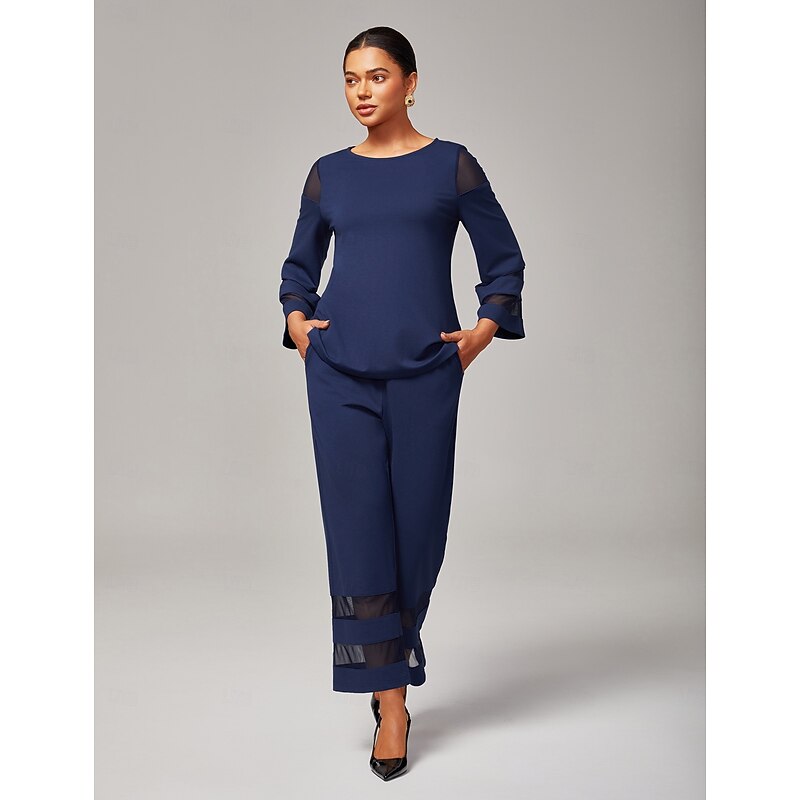 Women's Navy Blue Modal Chiffon Matching Set Fitted Blouse Cropped Pants Elegant Stylish Comfortable Daily Work Evening Wear Fall 1