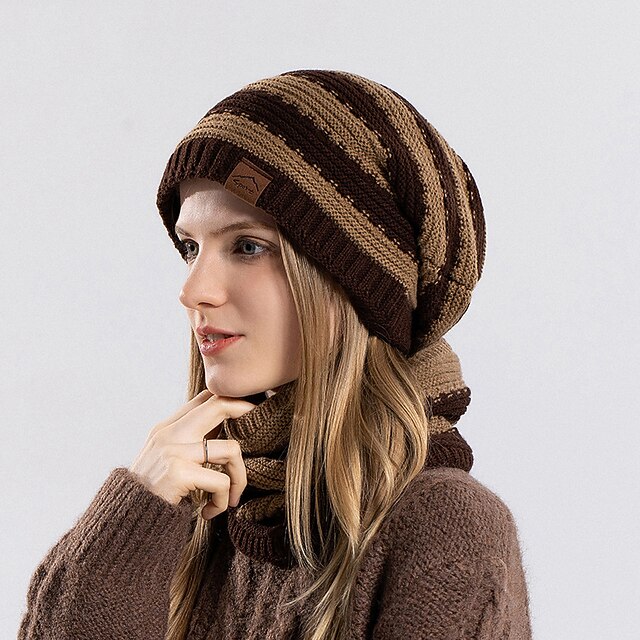 Highlights [Fabric] : Crafted from a soft and comfortable knit material, this winter set prioritizes warmth and coziness, perfect for chilly weather. The high-quality fabric ensures a snug fit, keeping you warm during cold seasons. [Fit] : Featuring a slouchy beanie style, the hat offers a relaxed and timeless look. The matching scarf complements the beanie with its long and cozy design, ideal for layering and providing additional warmth. [Design Highlights] : The hat and scarf both showcase a classic striped pattern in neutral shades, allowing for versatile styling options. The design features subtle brown and beige stripes that add an understated elegance to the overall look, making it suitable for both casual and stylish winter outfits. [Occasions] : Perfect for a variety of activities, this set is ideal for outdoor sports like cycling and skiing, as well as daily wear in the cooler months. Whether you're hitting the slopes or going on a casual winter stroll, this ensemble offers both functionality and style. [Size] : Available in one size, the set is designed to comfortably fit most women. The knit material provides a stretchy and accommodating fit, ensuring both the hat and scarf will cover and protect against the cold effectively.