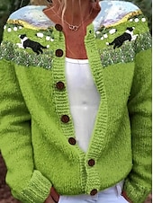 More information about Women's Cardigan Sweater Knitted Ribbed Button Front Round Neck Long Sleeve Lightweight female Daily Animal Crew Neck V Neck Buttons Print Long Tops Knit Outdoor Weekend Green Fall Winter