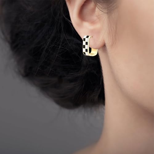 HOT ! Checkered Earrings, Creative Black And White Checkered Oval Hoop Earrings Vintage Gold Hoop Earrings Interesting Earrings for Women