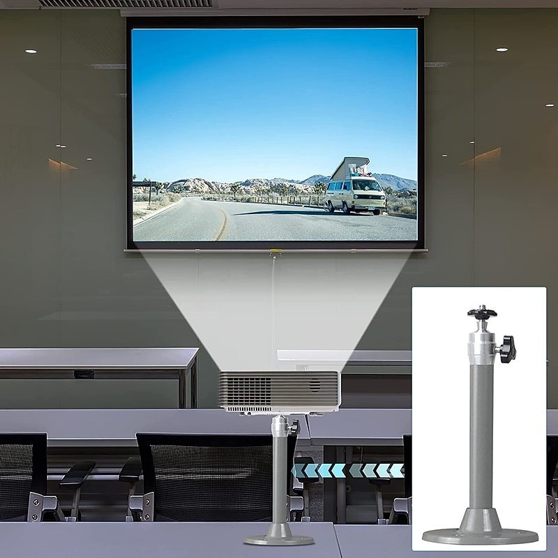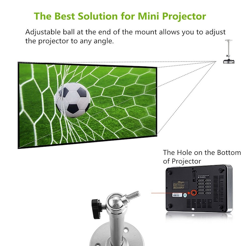 Highlights Product Selling Points: 1. Compatible with Most Mini Projectors: The Universal Projector Mount is designed to fit the majority of mini projectors, offering wide compatibility. 2. Three Sizes of Screw Adapters: Includes three screw adapters with sizes of 3.9mm, 6mm, and 6.35mm, ensuring a secure fit for different projector models. 3. Adjustable Tilt and Rotate Angles: Offers a tilt angle of up to 90 degrees and a 360-degree rotation angle, allowing you to easily adjust the projector to your preferred viewing position. 4. Strong and Durable: It has a safety load of up to 5KG, guaranteeing stable support for your projector. 5. Easy Installation: Comes with accessories, screws, and three adapters, making installation quick and hassle-free. Simply rotate the knob to tighten and secure the mount at the desired angle. 6. Triple-Screw Adapters: Ensures a secure fit for projectors with tripod screw hole. 7. Sleek and Convenient Design: The projector mount pole is designed for simplicity and convenience, adding a touch of elegance to your projector setup.