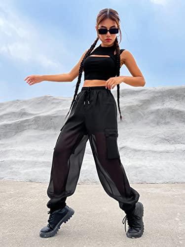 OYOANGLE Women's Mesh Sheer Drawstring Waist Flap Pocket Streetwear Jogger Cargo Pants 6
