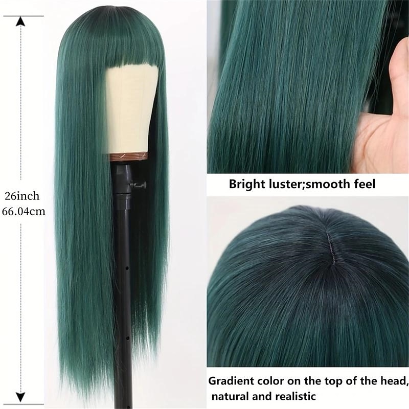 Ombre Green Wig 26 Inch Long Straight Wig With Bangs Synthetic Heat Resistant Cosplay Costume Halloween Wigs For Women Christmas Party Wigs 18