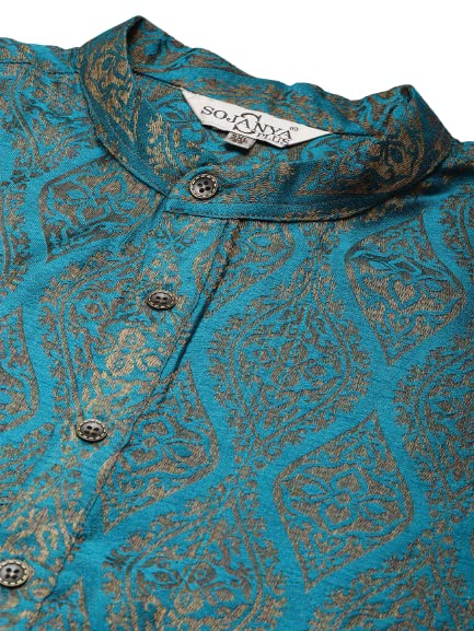 HOT ! Sojanya Plus Men's Jacquard Silk Teal Blue & Gold Kurta & Off-White Churidar Pyjama Set