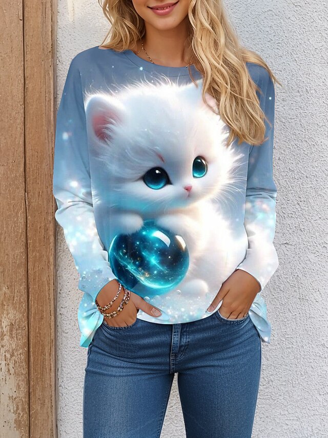 Highlights [Fabric] : Crafted from a soft and cozy polyester blend, this women's T-shirt offers warmth and comfort, making it ideal for both spring and fall wear. The fabric's micro-elasticity ensures a comfortable fit that adapts to your movements. [Fit] : Featuring a regular fit, this long-sleeve tee provides a versatile and casual look, perfect for everyday wear. The round neckline complements its contemporary style while ensuring ease of wear. [Design Highlights] : The standout feature is the enchanting 3D printed design of a fluffy white kitten with mesmerizing blue eyes holding a vibrant, glowing orb. This captivating graphic adds a whimsical and artistic touch to the shirt, making it an appealing choice for animal lovers or those who enjoy playful designs. The soft blues and whites of the color palette beautifully enhance the overall theme. [Occasions] : Perfect for daily wear, weekend outings, or casual gatherings, this T-shirt effortlessly adds charm and style to your wardrobe. Whether you're relaxing at home or out with friends, its playful yet fashionable style suits a variety of settings. [Size Range] : Available in sizes S, M, L, XL, and 2XL, this tee offers a comfortable fit for a wide range of body types, ensuring there's an option for every woman seeking both style and comfort.