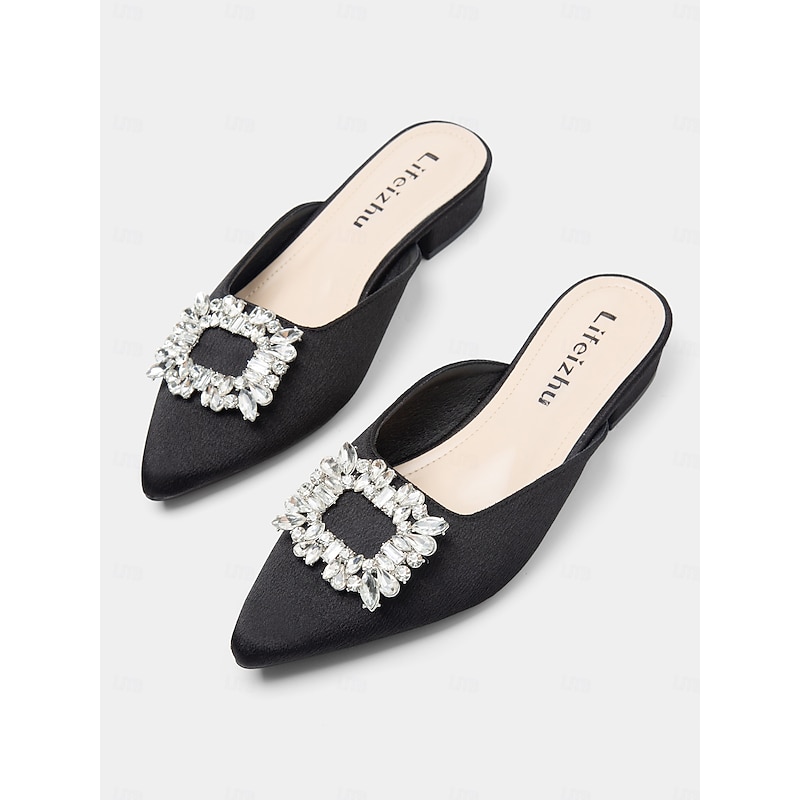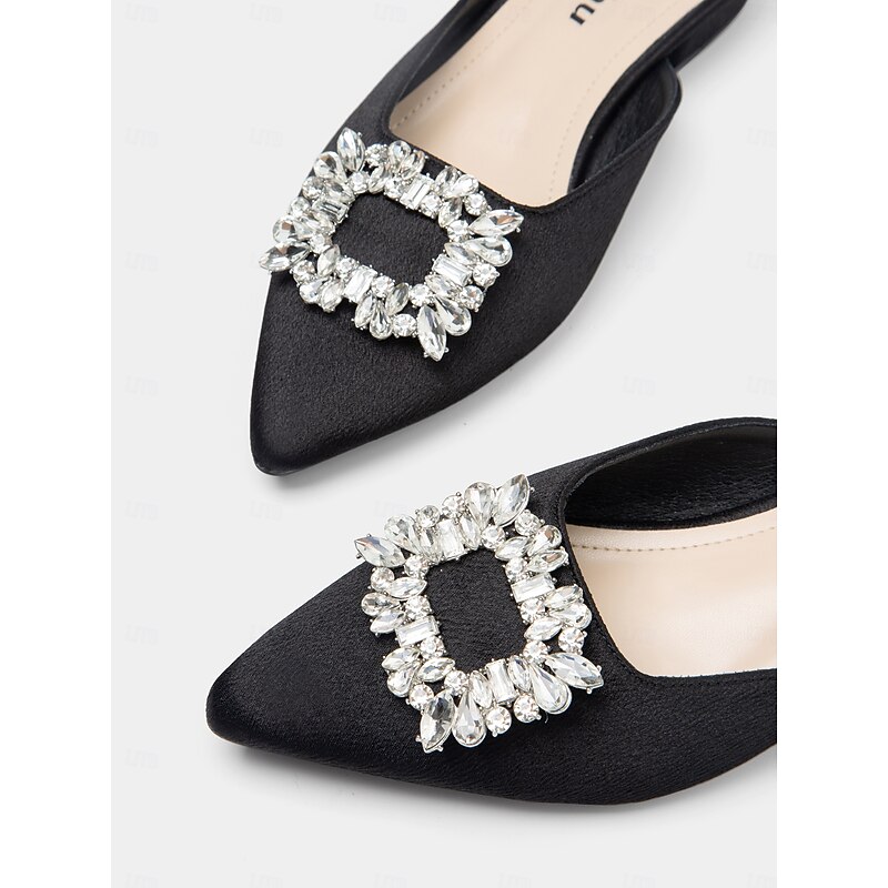 HOT ! Women's Black Satin Pointed-Toe Mules with Rhinestone Buckle - Elegant Slip-On Flats for Evening and Formal Occasions