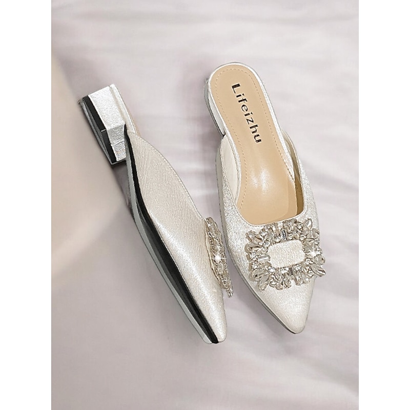Highlights [Fabric] Meticulously crafted from smooth satin-like materials, these mules offer a luxurious and glossy finish that exudes elegance. The interior lining is made of soft synthetic leather, ensuring a comfortable fit for extended wear. [Silhouette] These flats feature a sophisticated pointed-toe design that provides a sleek and modern aesthetic. The flat heel ensures ease of movement, making them ideal for both casual and formal settings. [Design Highlights] The standout feature of these mules is the sparkling rhinestone embellishment, forming a decorative buckle on the upper. This detail adds a touch of glamour and sophistication, making these shoes a perfect choice for any event where elegance and style are a must. [Occasions] Perfect for a variety of occasions, from parties to formal evening events. These mules seamlessly blend with both chic casual outfits and elegant formal attire, making them a versatile addition to any wardrobe throughout the seasons. [Size Information] Available in a range of standard sizes from US5.5 to US10.5, these mules offer a fit that suits your regular shoe selection, ensuring comfort and style.