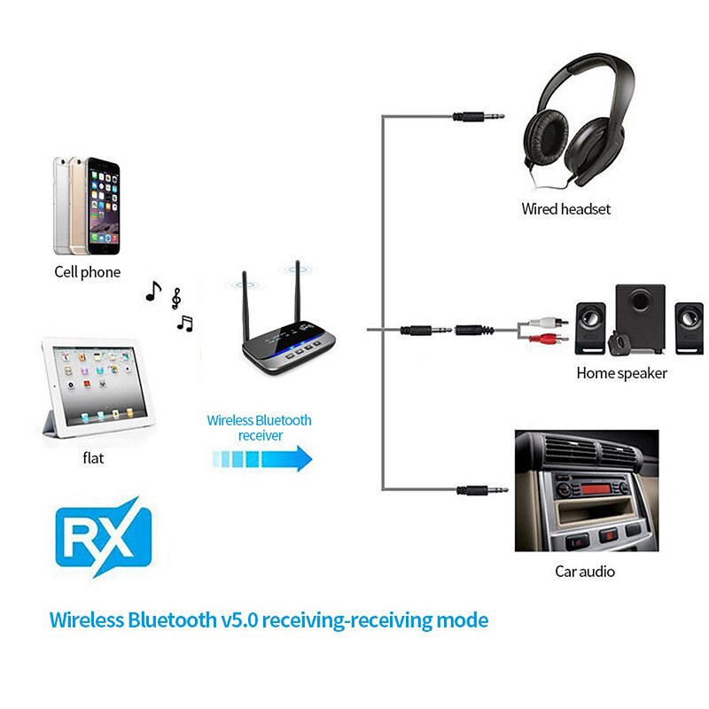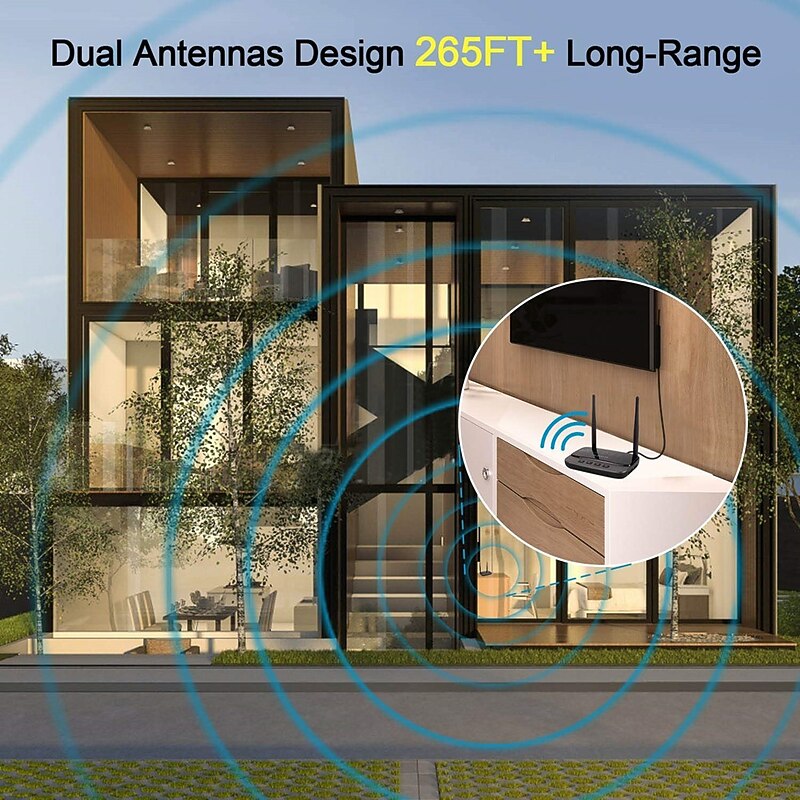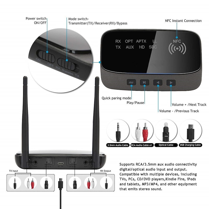 Highlights Product Selling Points: 1. Long-Range Connectivity: Successfully tested over a range of 265ft(80m) in open air and over 100ft(30m) indoors without any stuck and delay. Dual antenna design ensures a wide and stable transmission range. 2. Extended Standby Time and NFC Capability: Built-in 1000MAH powerful battery provides 15 hours of solid use in TX mode and 20 hours in RX mode on a single charge. NFC function allows for fast linking. 3. 3-in-1 Mode: Can be used as a transmitter (TX mode) to enjoy high-fidelity audio wirelessly from devices like TVs and PCs, or as a receiver (RX mode) to make old home stereo systems Bluetooth-enabled. Bypass mode eliminates the need for unplugging wires. 4. Dual Stream and Multi-Point Connection: Supports simultaneous streaming to two headphones or speakers (Dual Stream) and connecting two smartphones at the same time (Multi-Point Connection). AptX Low Latency ensures optimal performance. 5. Bluetooth Extender: Can extend the range of Bluetooth by connecting to weak wireless audio devices or pairing with another Bluetooth adapter to boost the Bluetooth signal. 6. Multiple Bypass Work Modes: Offers 4 different work modes (Aux in/Aux out, Opt in/Opt out, Aux in/Opt out, Opt in/Aux out) to easily switch and adapt to different setups. 7. NFC Function: Simplifies pairing by placing the cellphone near the wireless Bluetooth receiver transmitter in pairing mode. Note: Requires a mobile phone with NFC function. 8. Pair with Each Other: Can work as a transmitter and receiver together, providing flexible audio solutions. 9. Package Contents: Includes Bluetooth Transmitter/Receiver Adapter, Micro USB charging cable, Digital Optical Toslink Audio Cable, and user manual.