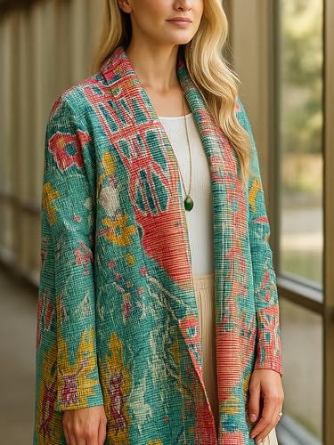 More information about Open Front Vintage Print Cardigan for Women Wrinkle-Free Long Sleeve Lapel Collar Long Coat 2025 Fall New