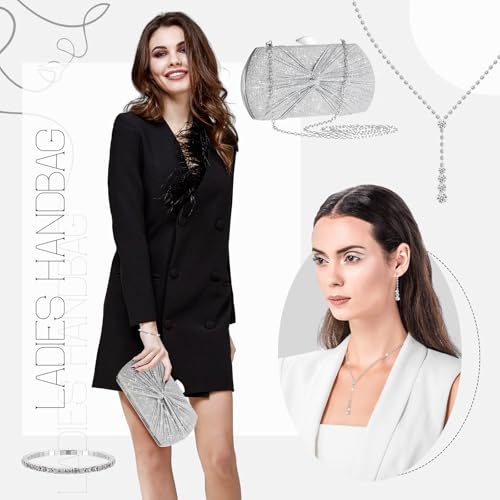 Blosssound 4 Pcs Silver Clutch Purse Jewelry Set for Women Includes Rhinestone Purse Silver Hand Bag Crystal Necklace Earrings Bracelets for Bridal Wedding Evening Party Accessories 2