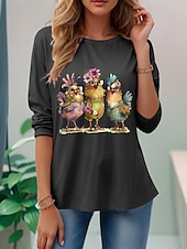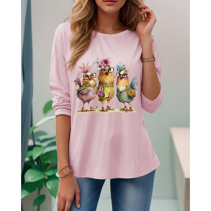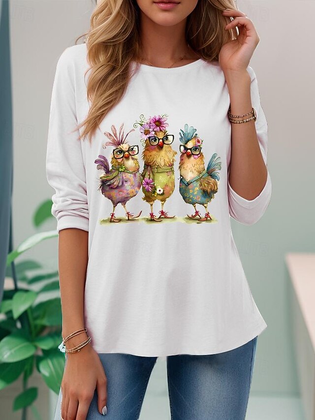 Highlights [Fabric] Crafted from 100% cotton, this women's long-sleeve T-shirt offers a soft and breathable fabric that provides comfort throughout the day. Its micro-elasticity ensures ease of movement and a cozy fit. [Fit] Designed with a regular fit and a crew neck, this T-shirt offers a relaxed and comfortable silhouette that suits casual, everyday wear. The regular top length and long sleeves make it versatile for both spring and fall seasons. [Design Highlights] The T-shirt features a whimsical and colorful print of quirky birds wearing glasses and accessories. The vibrant design stands out against a primarily white background, adding a playful and artistic touch to any outfit. [Occasions] Ideal for daily wear, this stylish and casual T-shirt is perfect for those who appreciate unique fashion infused with humor and charm. It's suitable for a variety of informal settings and can be easily paired with jeans or comfortable pants for a laid-back look. [Size Range] Available in sizes S, M, L, XL, 2XL, and 3XL, this T-shirt accommodates a wide range of body types, ensuring a flattering fit for everyone.