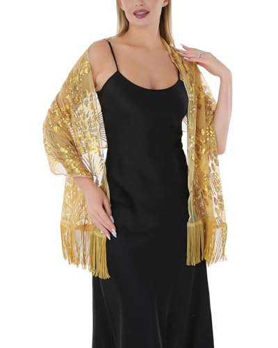 • Long Shawls and Wraps for Evening Dresses,This shawl with sheer,sequin fabric made is sparkling and eye-catching;This sequined shawl adds a touch of glamour and shine,Glittering sequins is not easily shed;A stylish mesh combined with playful fringe trim