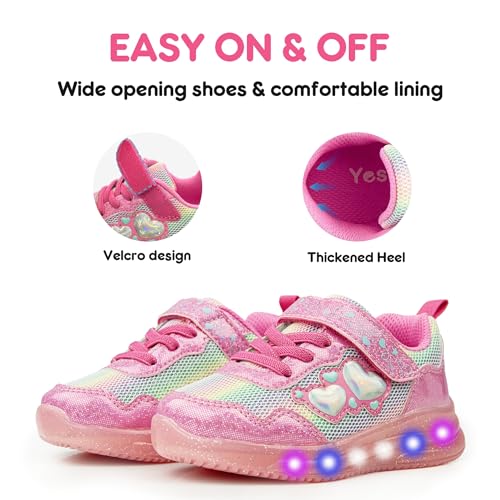 • Breathable Mesh Upper and Cute Glossy Appearance: Toddler girls light up shoes with mesh upper, breathable and lightweight fabric keeps feet dry and comfortable, suit for daily or other outdoor sports. This toddler light up shoes girl has cute and glossy appearance and tiny diva hearts adorned over the side of girl light up sneakers, which adds a nice touch to them in design.