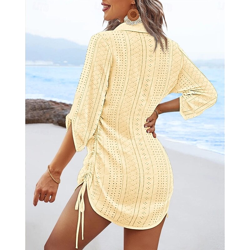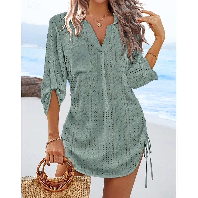 Highlights - Stay stylish this fall in our elegant women's dress - Made with high-quality polyester fabric for a comfortable fit - Long sleeves to keep you warm during daily activities - Features a solid color design with eyelet and drawstring details - Designed with a trendy V neck neckline - Perfect for any occasion, from daily wear to special events - Mini dress length type for a flattering look