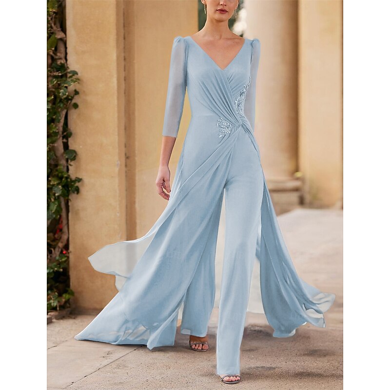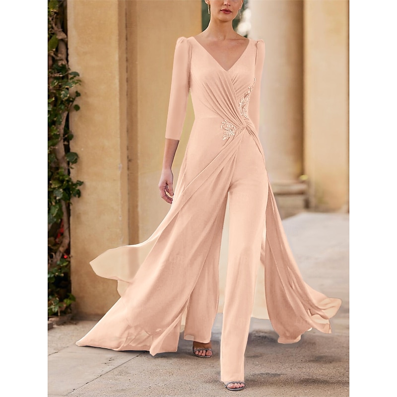 More information about Jumpsuit Mother of the Bride Formal Wedding Guest Elegant Straight Neckline V Neck Floor Length Chiffon 3/4 Length Sleeve with Ruched Cascading Ruffles