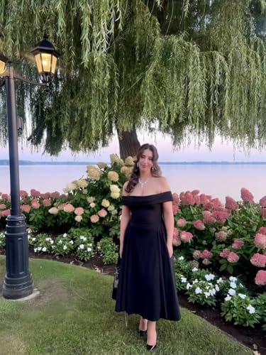 • :)Feature: Elegant yet classy, this satin midi dress is a staple style for any event; Satin prom dress, off the shoulder formal dress, a-line cocktail dress, pleated date night dress, wedding guest dress; High quality satin fabric is skin friendly, 100% handmade, keeping you elegant and comfortable all day long; Built in bra pad