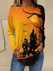 More information about Halloween Women's T shirt Bat Graphic Geometric Vintage Casual Long Sleeve Crew Neck Regular Tops Weekend Print Yellow Orange Spring Fall