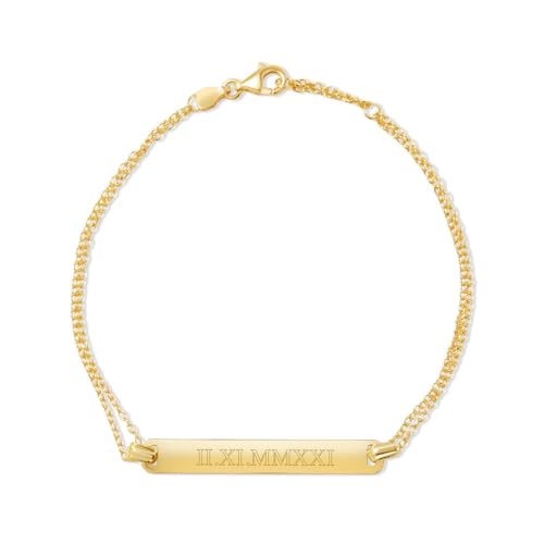 • Features: Double rolo chains and a customizable nameplate to personalize as a roman numeral date bracelet. Custom engraved roman numeral bracelets are an easy keepsake gift to celebrate any special moment or place in time with a loved one or friend.