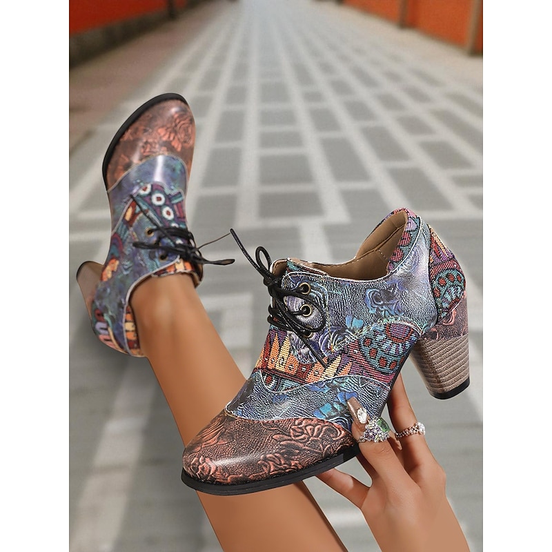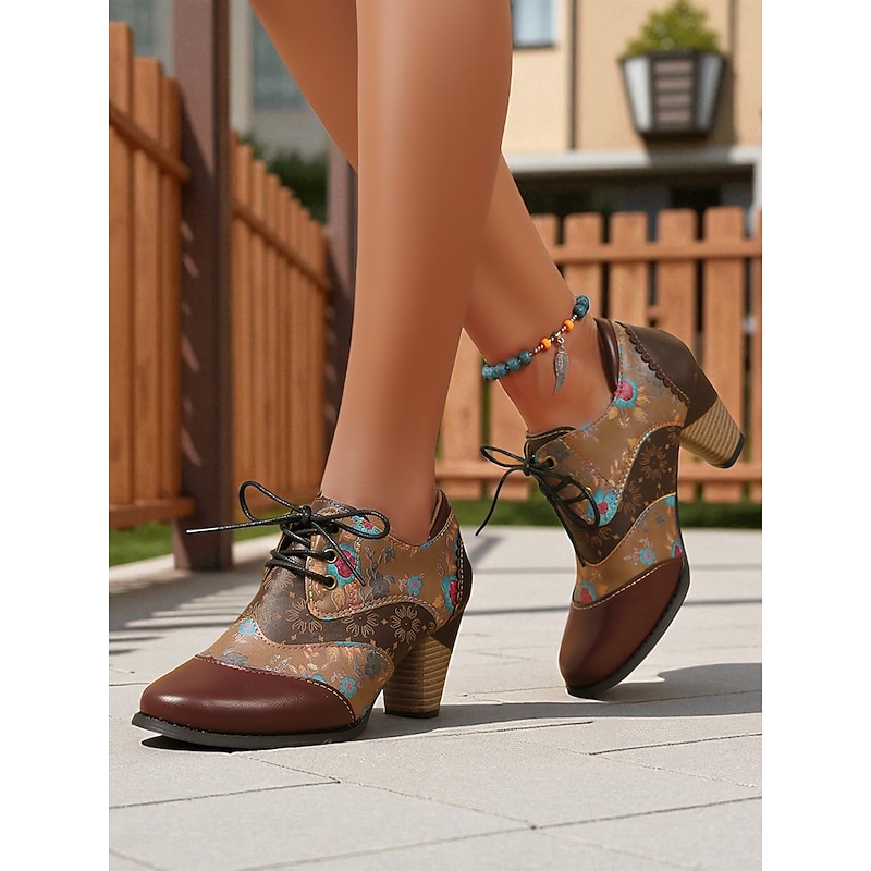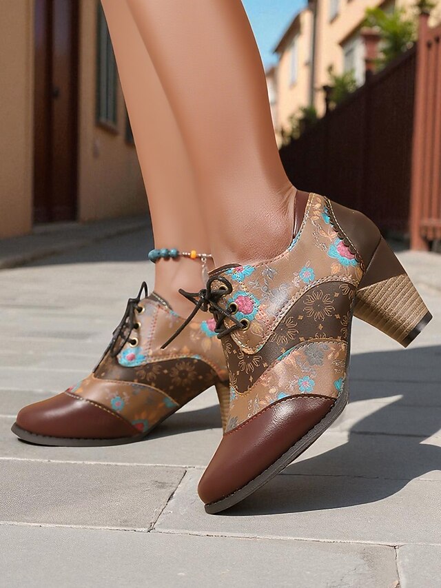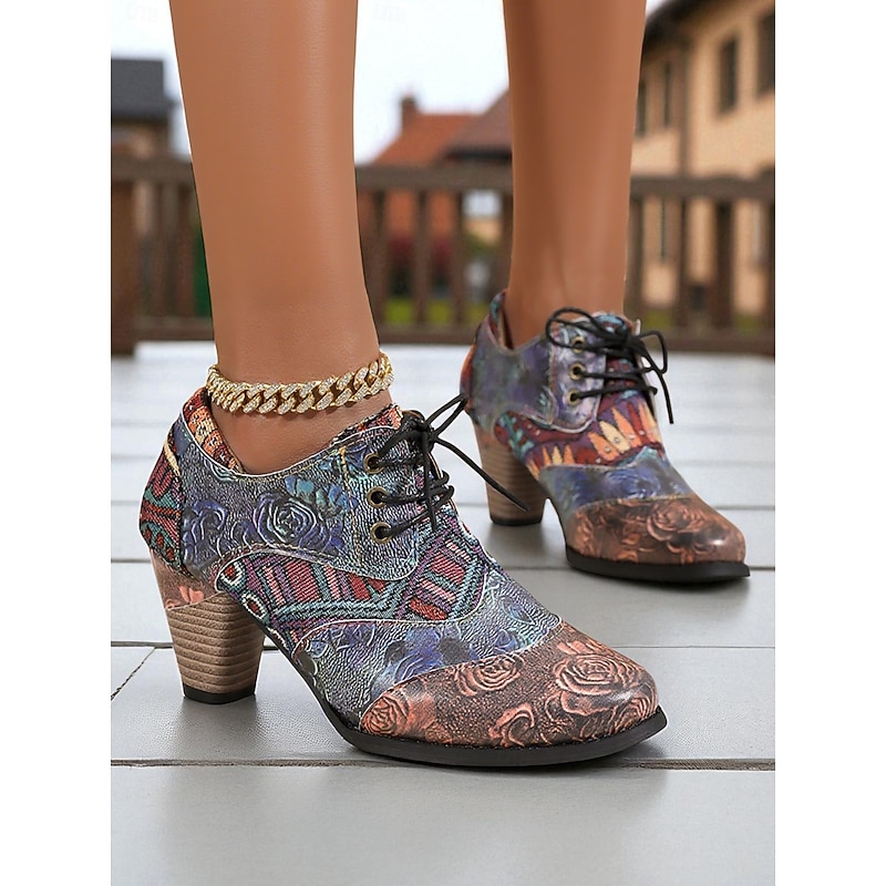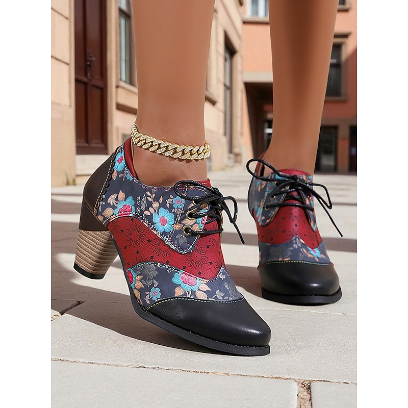 HOT ! Women's Vintage Floral Lace-Up Oxford Shoes – Multi-Color Faux Leather and Fabric Patchwork Chunky Heel Oxfords with Round Toe, Retro Victorian Style for Casual Wear, Parties, and Fall Winter Outfits