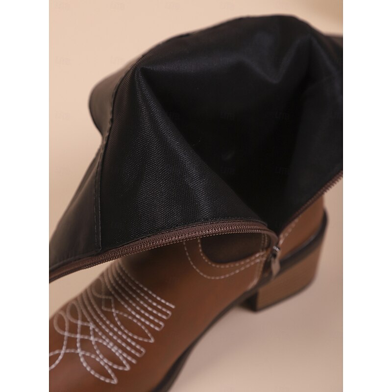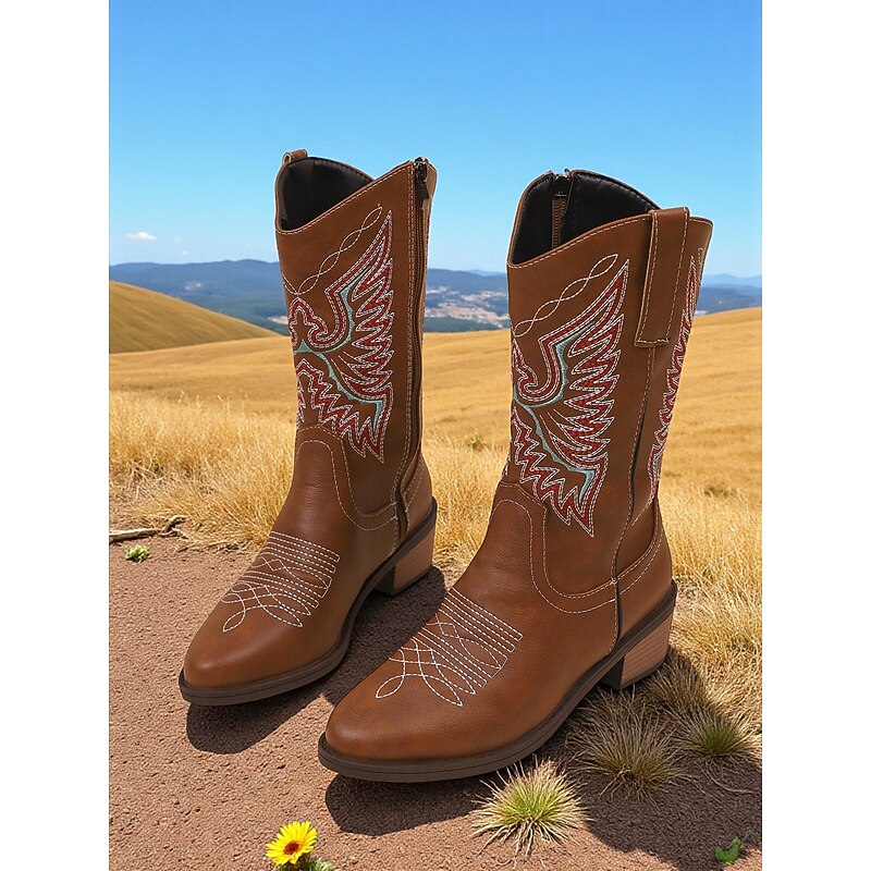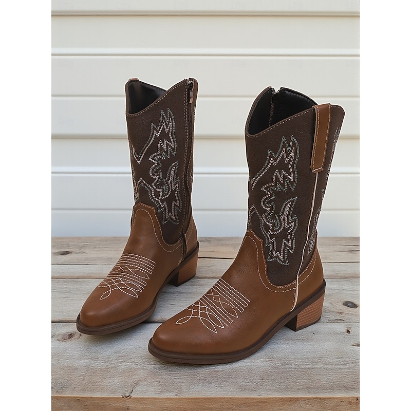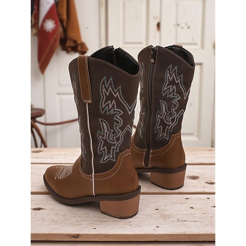 HOT ! Women's Brown Faux Leather Cowboy Western Boots with Embroidered Stitching, Low Heel Mid-Calf Boots for Rodeo, Festivals and Everyday Wear