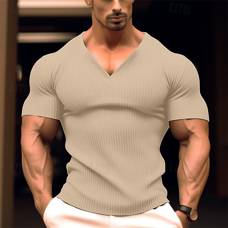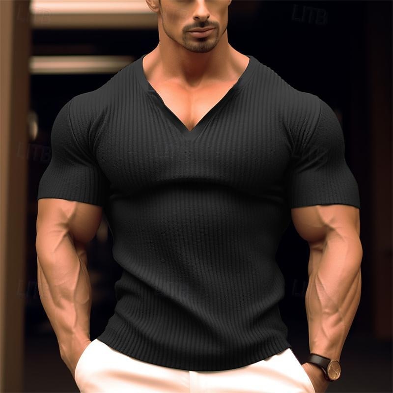 More information about Men's T Shirt Muscle Shirt Ribbed Knit tee Tee Top Short Sleeves V Neck Summer Plain Pit Strip Fashion Designer Basic Buttons Vacation Street Going out Black White Navy Blue Top Tee for Men