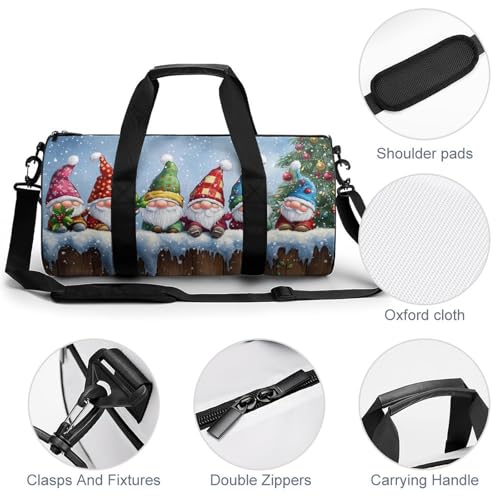 HOT ! Christmas Gnomes Sitting on Wooden Fence Travel Gym Bag for Women Men Colorful Checkered Hats Cylindrical Duffle Bag Sport Workout Bag with Shoulder Strap